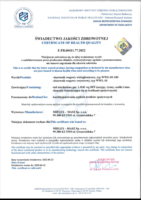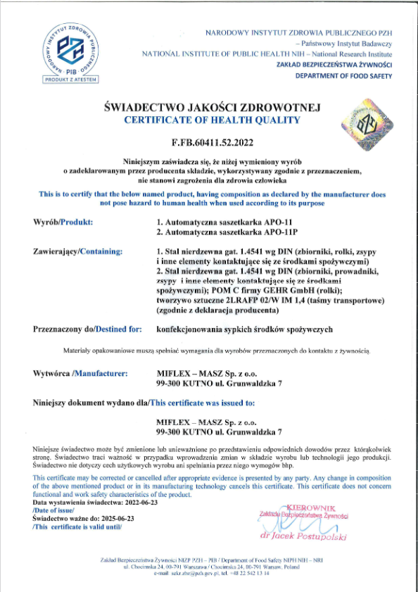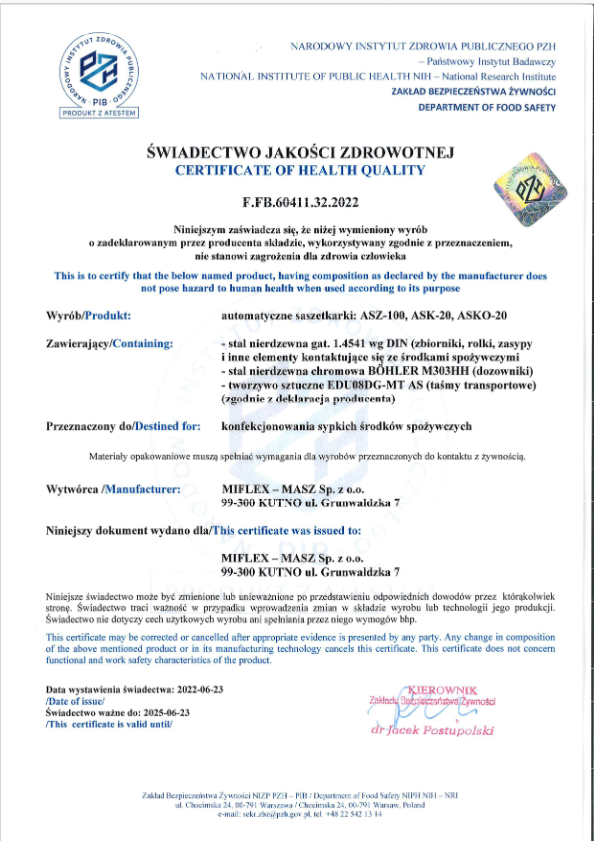 Potwierdzeniem dbałości o wysoką jakość produkcyjną mogą być Certyfikaty Jakości Zdrowotnej nadane nam przez Państwowy Zakład Higieny Narodowego Instytutu Zdrowia Publicznego.